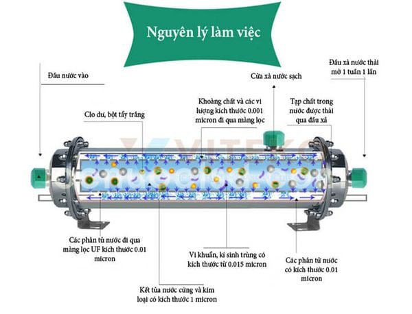 Màng UF tạo nên một rào cản chắc chắn ngăn cản các vi sinh vật, bào tử và loại bỏ màu, chất hữu cơ (trong nguồn nước tự nhiên thường xuất hiện các chất tiết ra từ vỏ cây, các chất mùn, bùn, gỉ sắt các độc tố và vi khuẩn có hại…vv).